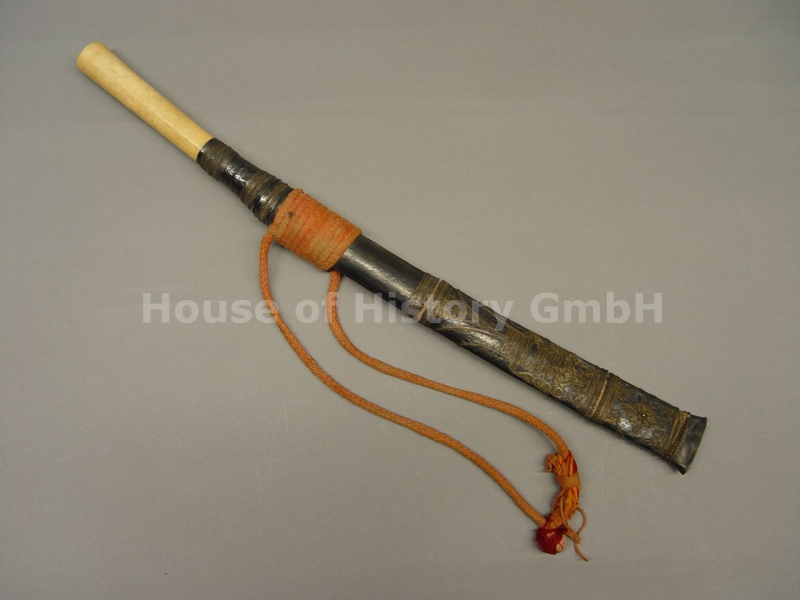 Burma Myanmar Dha / Dolch, runder länglicher Beingriff mit Silber Montierung, flugrostige Klinge aus Eisen, Scheide aus Holz komplett mit verziertem Silberblech ummantelt, noch mit original gewickeltem Trageband, um 1850, Länge ca.53 cm, schöner Zustand, dekorativ mit hochwertigen Verzierungen aus echtem Silber