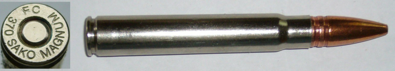 eine Deko-Patrone .370 Sako. Diese Patrone ist mit der 9,3x66 Sako identisch. Für den amerikan. Markt wurde sie von Federal als .370 SAKO Mag. produziert, ist jedoch nach sehr kurzer Zeit wieder am Markt verschwunden ( FC 370 SAKO MAGNUM ) Patrone ist ohne Ladung, zum Nachweis ist eine Klapper-Kugel eingelegt.