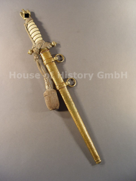 Kriegsmarine Offiziersdolch mit Portepee, Hersteller: Alcoso Solingen, gehämmerte Scheide, weißer Griff, mit Segelschiff Klingenätzung, sehr schöner leicht getragener Zustand, seltener Hersteller
