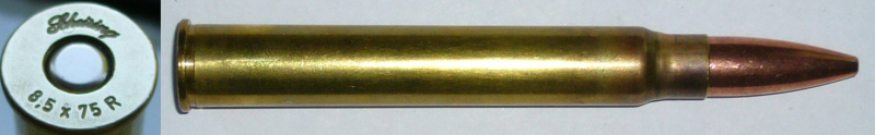 eine Deko-Patrone 8,5x75 R Scheiring ( scheiring 8,5x75 R ) Patrone ist ohne Ladung, zum Nachweis ist eine Klapper-Kugel eingelegt.