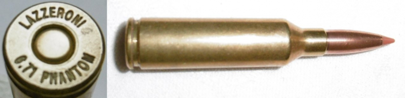 eine Deko-Patrone 6,71 Phantom ( LAZZERONI 6.71 PHANTOM ) ein Eigenkaliber der Lazzeroni Co. in Tucson, Arizona. Patrone ist ohne Ladung, zum Nachweis ist eine Klapper-Kugel eingelegt.