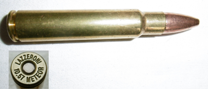 eine Deko-Patrone 10.57 Meteor ( LAZZERONI 10.57 METEOR ) ein Eigenkaliber der Lazzeroni Co. in Tucson, Arizona. Patrone ist ohne Ladung, zum Nachweis ist eine Klapper-Kugel eingelegt.