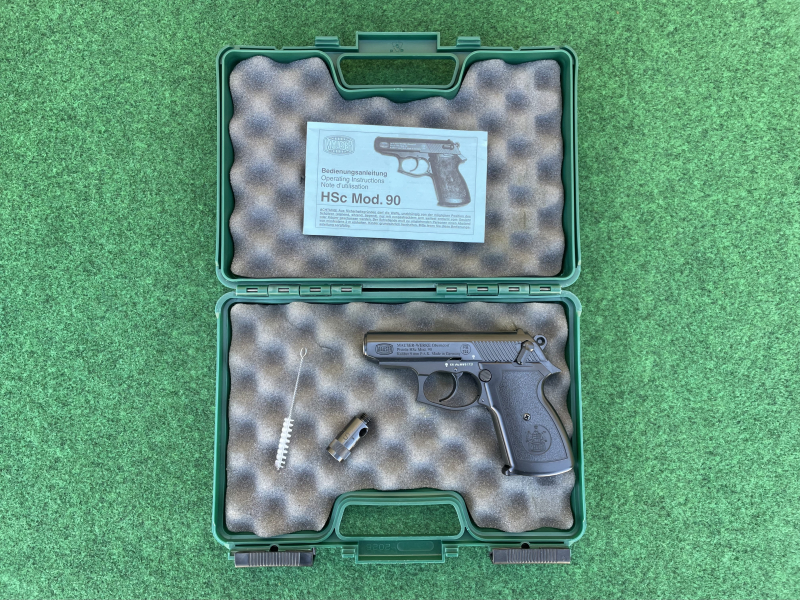 Mauser HSc Mod. 90 Kal. 9mm P.A.K. Erste Ausführung. Die Pistole befindet sich in einem neuwertigem Zustand und wurde nicht geschossen. Beschuss KH für 1997 erste Ausführung, hier ist das Magazin nur mit Mauser MOD. 90 beschriftet und nicht wie spätere Varianten zusätzlich mit RG88, des Weiteren ist die Laufsperre noch eine andere hier ist der innere Steg lose zusätzlich gibt es eine Ausfräsung unterhalb des Laufes. Die Pistole kommt im Original Koffer mit Bedienungsanleitung, Reinigungsbürste sowie dem Abschussbecher. Privatverkauf, keine Garantie, Gewährleistung oder Rücknahme.