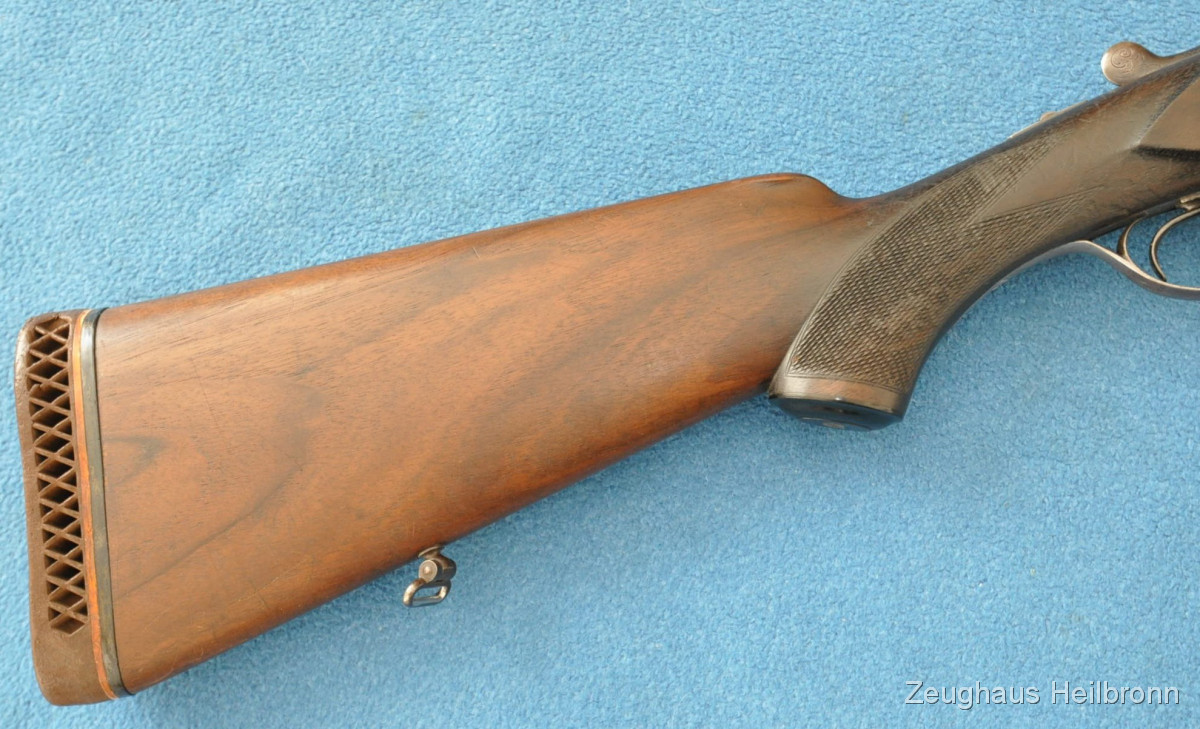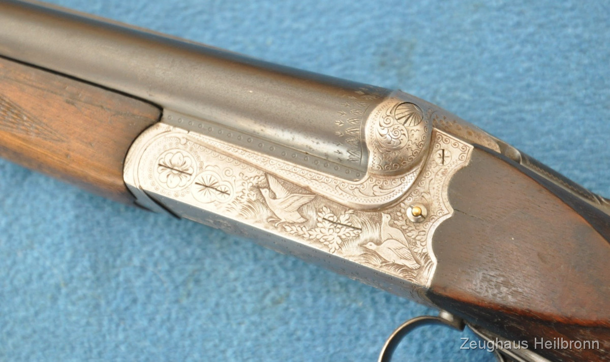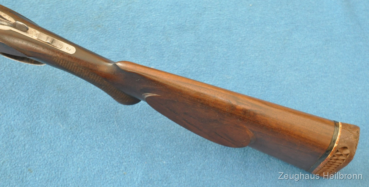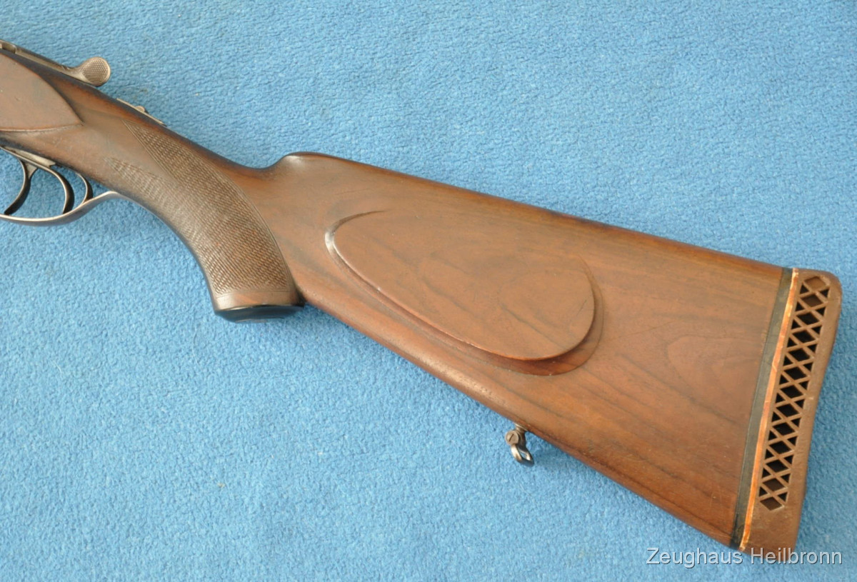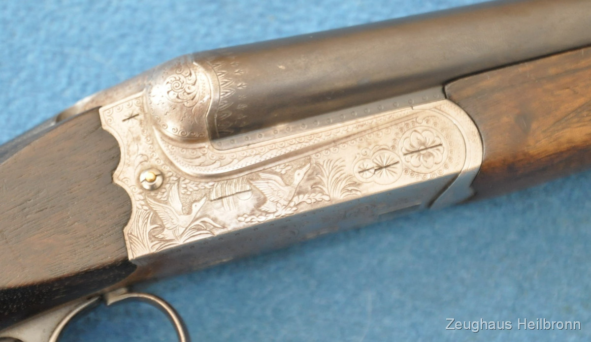 Waffe in einem leicht gebrauchten Zustand, System hat leicht Luft, Läufe blank. Ejector rechter Lauf ohne Funktion. Hergestellt 1969, hochwertige Büchsenmacherarbeit, Systemkasten mit Gravur, Signalstifte.