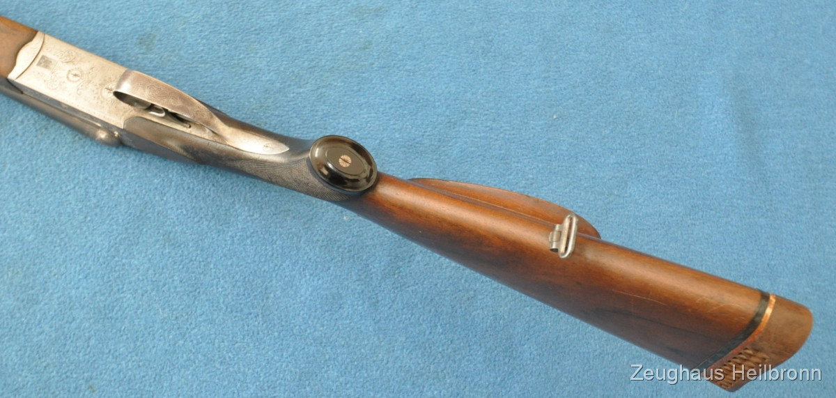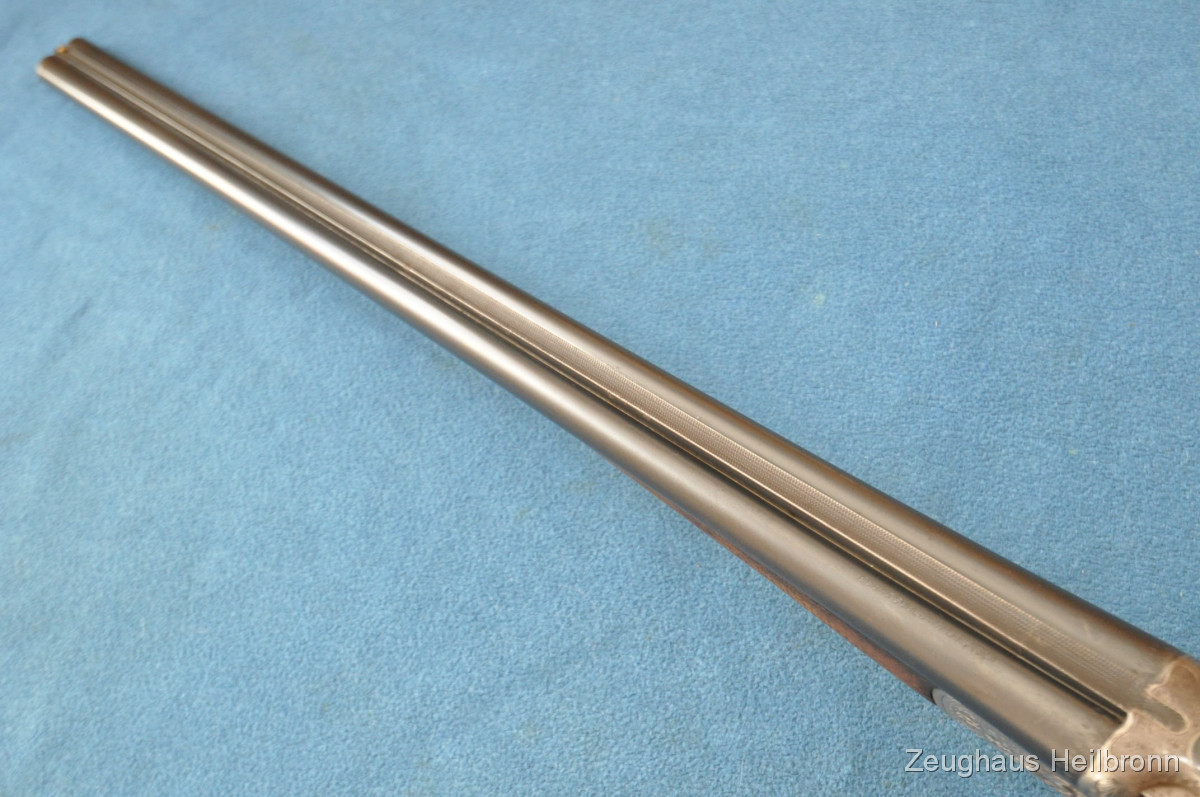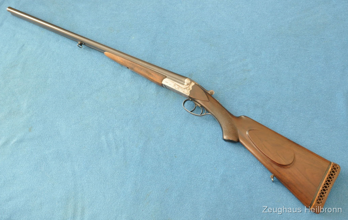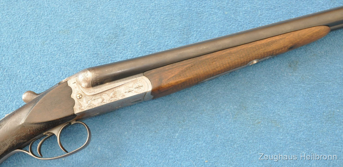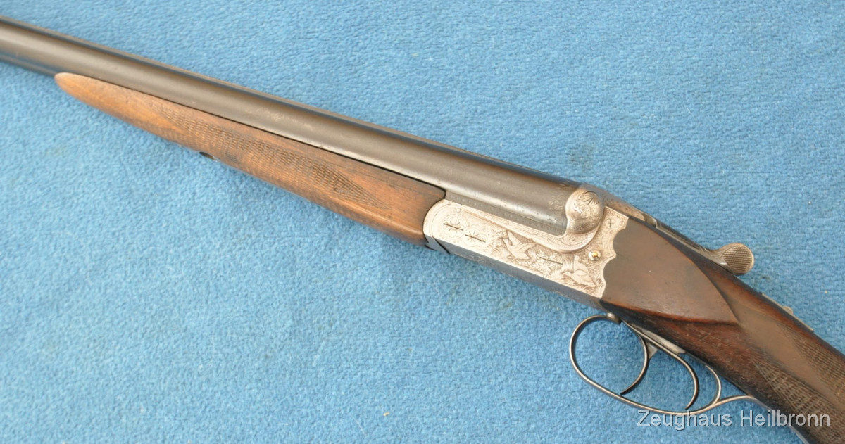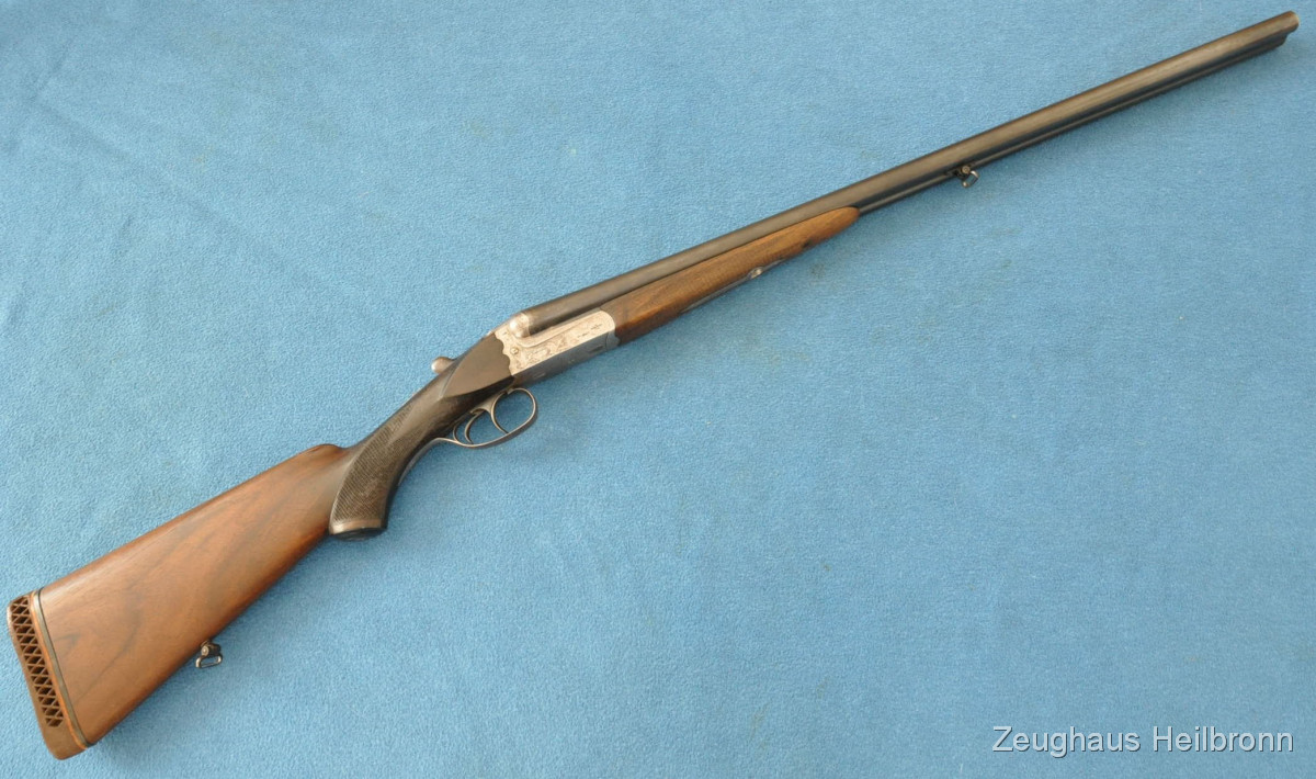 Waffe in einem leicht gebrauchten Zustand, System hat leicht Luft, Läufe blank. Ejector rechter Lauf ohne Funktion. Hergestellt 1969, hochwertige Büchsenmacherarbeit, Systemkasten mit Gravur, Signalstifte.