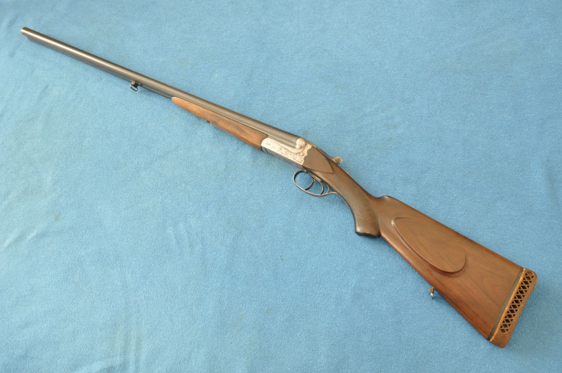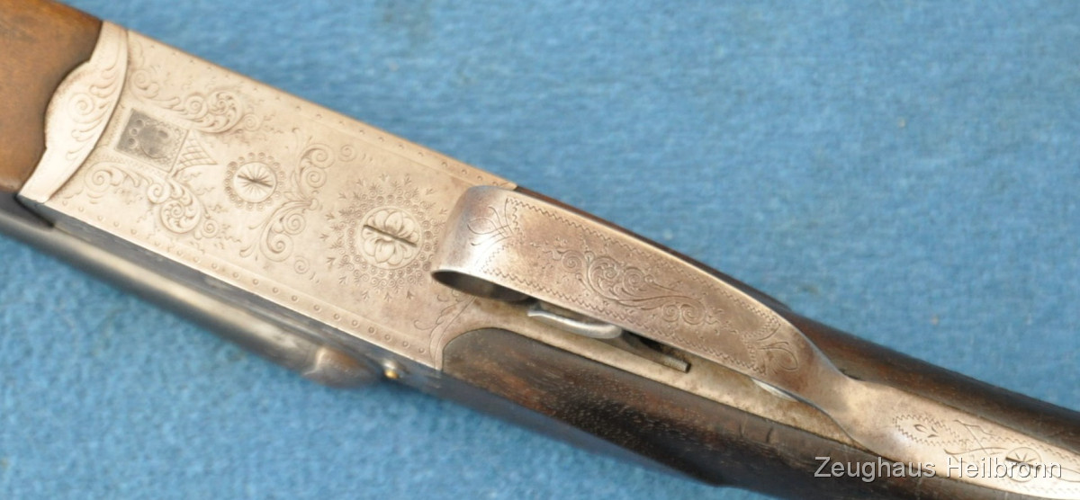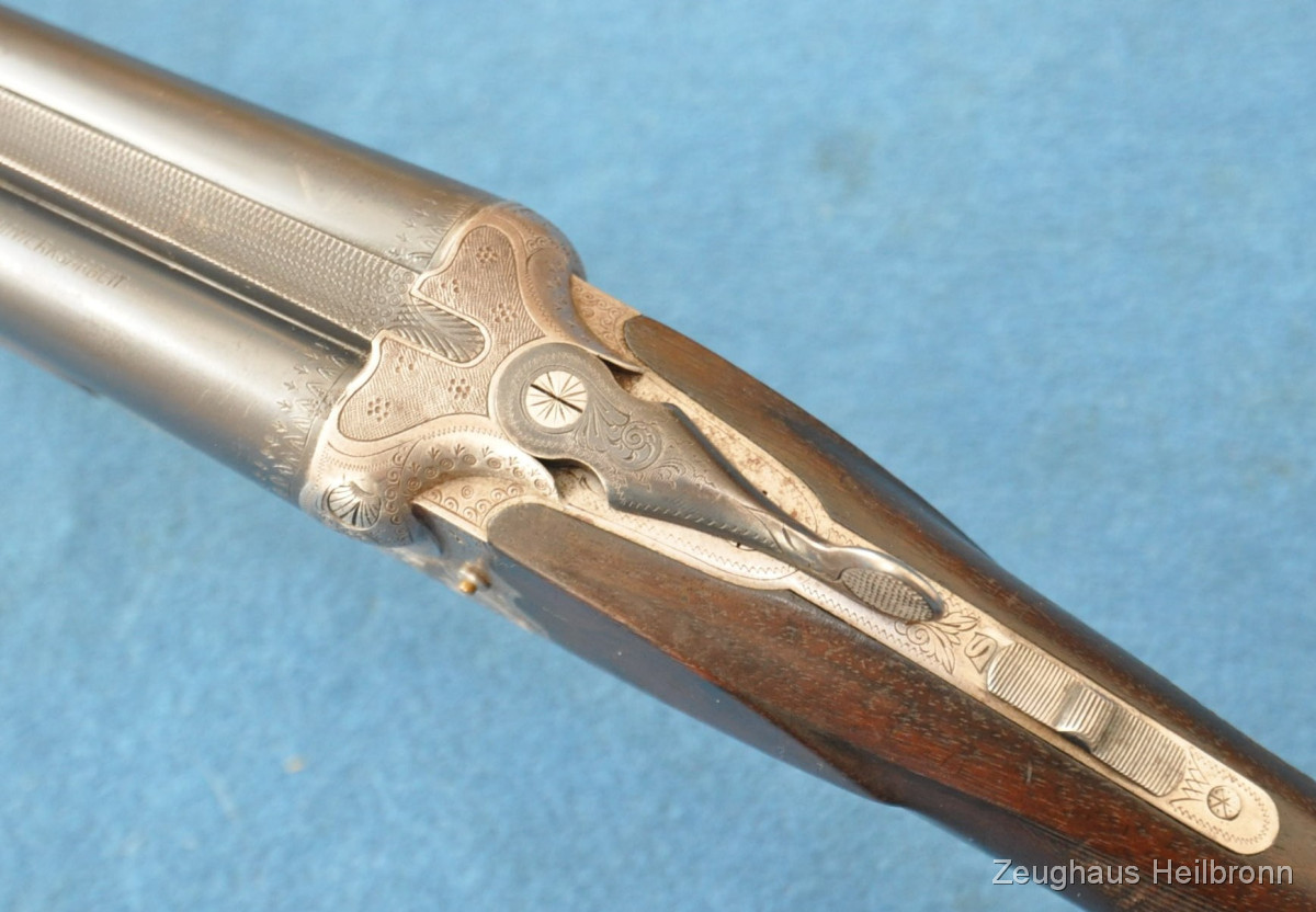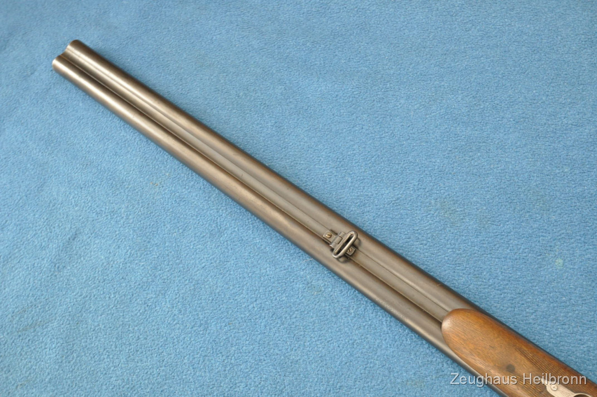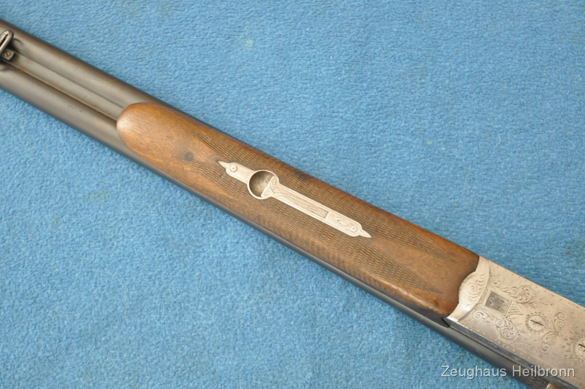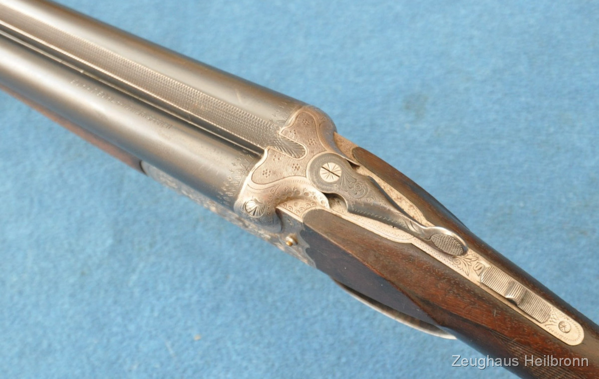 Waffe in einem leicht gebrauchten Zustand, System hat leicht Luft, Läufe blank. Ejector rechter Lauf ohne Funktion. Hergestellt 1969, hochwertige Büchsenmacherarbeit, Systemkasten mit Gravur, Signalstifte.