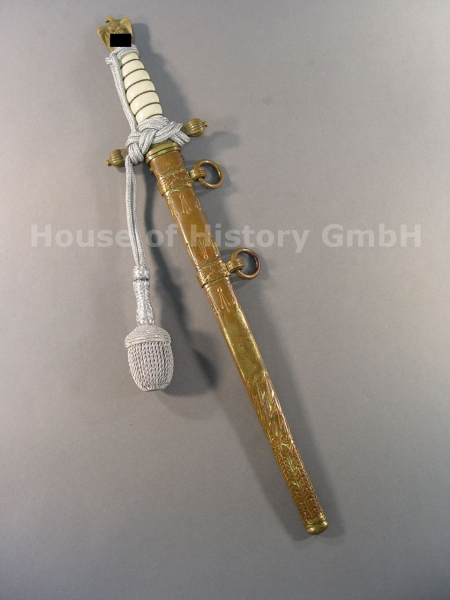 Kriegsmarine Offiziersdolch mit Portepee, Hersteller: Puma Solingen, Blitzscheide, weißer Griff, mit Segelschiff Klingenätzung, sehr schönes getragenes Stück mit Charakter, seltener Dolch des Hersteller Puma