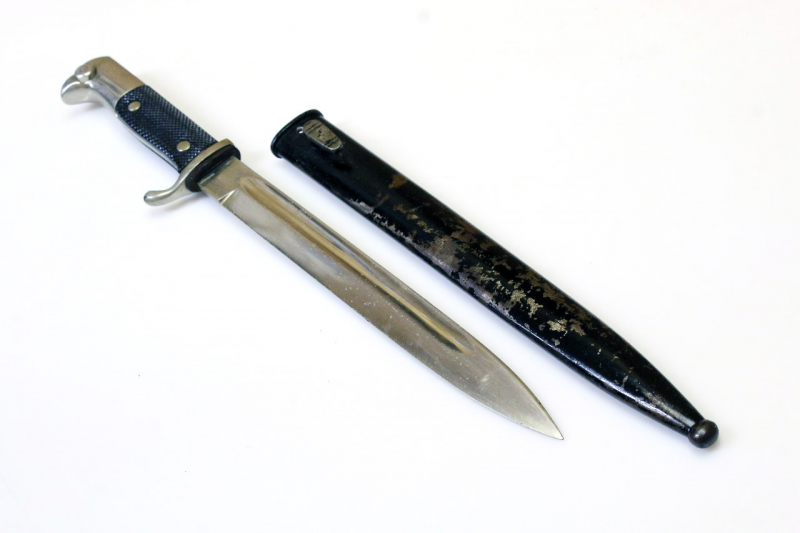Das Seitengewehr sehr gut erhalten. Die Scheide mit Altersspuren, Lackverlust. Wohl durch das Entfernen von Korrosion.
