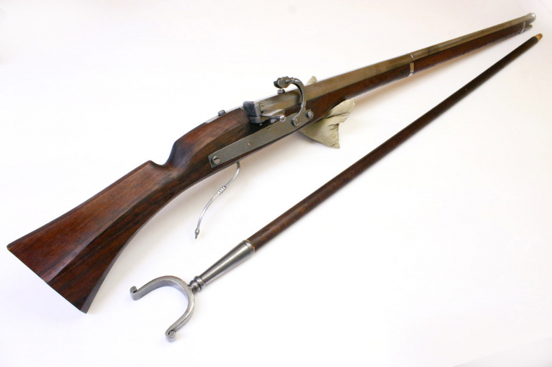 Nussholz-Ganzschaft. Kantiger, flacher Kolben. Blanke, eiserne Garnitur. Hölzerner Ladestock mit blanken, eisernen Dopper. Der Schaft mit einem Brandstempel versehen, "Waffenschmiede im Zeughaus Überlingen".