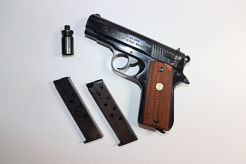 RARE Erma Modell EGP 45 KAL. 8 mm Knall mit der alten PTB 297 in sehr gutem gebrauchten Zustand mit insgesamt zwei Magazine und Original Abschußbecher.