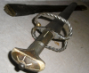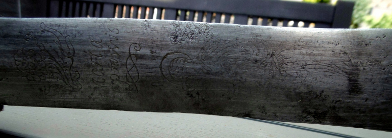 Katzbalger 16/17 Jhd. mit geätzter Klinge und mit Scheide. Stark verputzte, beidseitig geätzte Klinge mit religiösen Motiven. Griffstück aus Eisen, Messing, Holz und Horn. Scheide aus Leder mit Messingortblech. Gesamtlänge 70 cm. Klinge am Ansatz 45 mm.