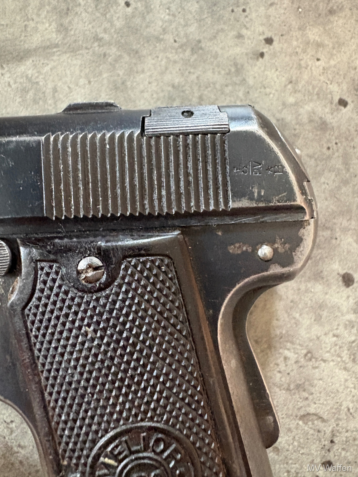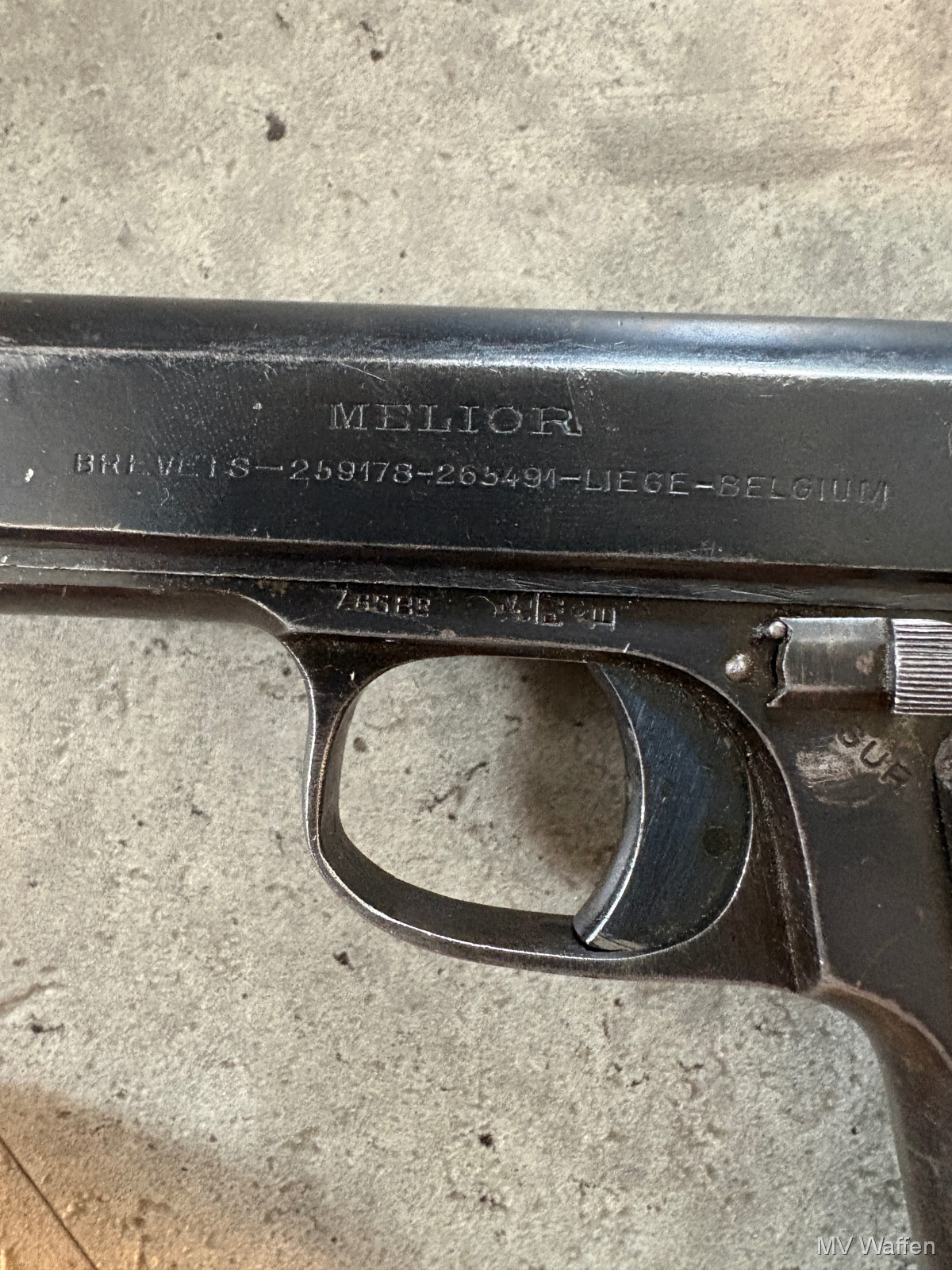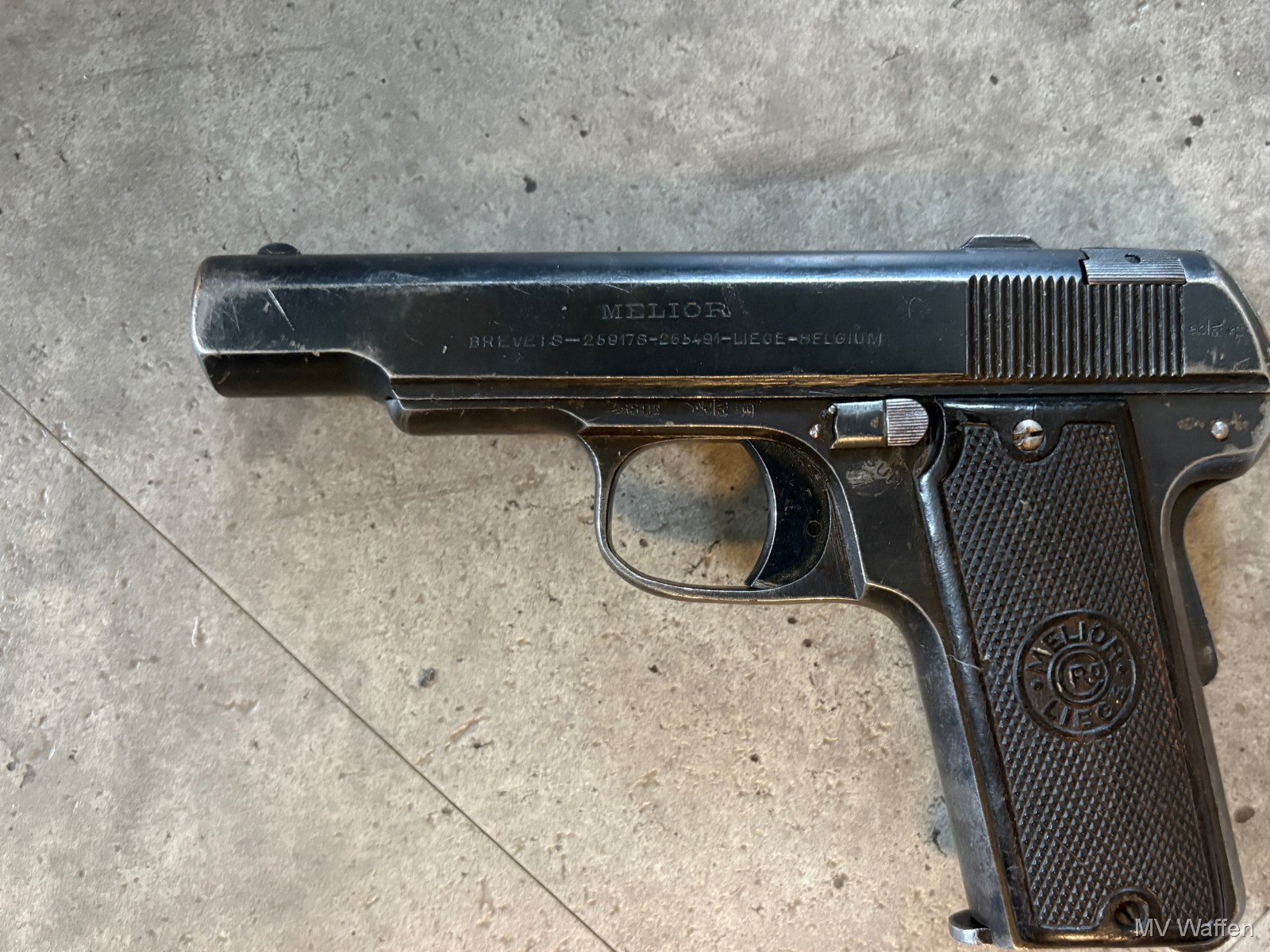 Sehr schöne kleine Melior Taschen Pistole in Kaliber 7,65 Browning. In Sammelwürdigen Zustand siehe Bilder. Lauf Gut. Natürlich wie immer völlig unbearbeitet um Ihnen eine ehrlichen Eindruck der Waffe vermitteln zu können. Direktversand an Europäische Händler möglich. Fragen Sie bitte nach den Versandkosten. Die Rechnung für die Waffe liegt dann im Original dem Paket bei. Waffe kann natürlich gerne, nach vorheriger Absprache in Wolfratshausen besichtigt werden