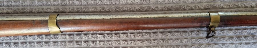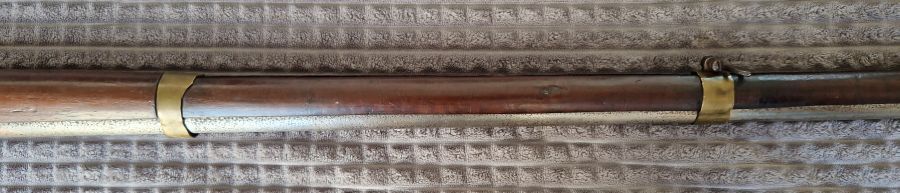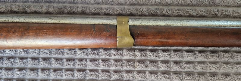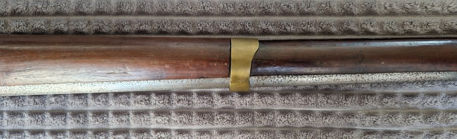 Messingbeschläge. Kolbenkappe in Eisen. Vorderer Messingbund mit Feder. Die zwei hinteren ohne Feder.