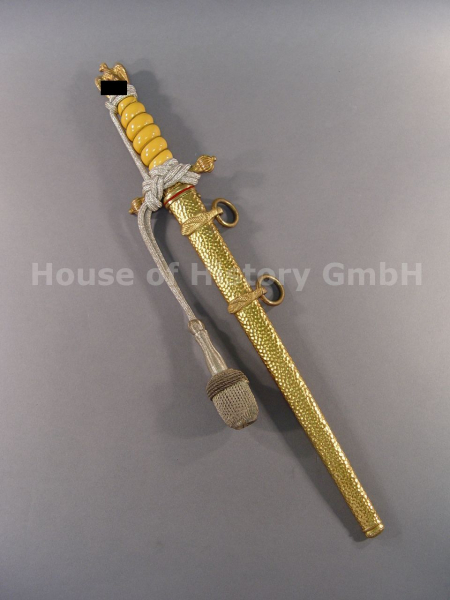 Kriegsmarine Offiziersdolch mit Portepee, Hersteller: P.D. Lüneschloss Solingen, gehämmerte Scheide mit Taubändern, gelber Griff, ohne Klingenätzung, hervorragender Zustand mit leuchtender Feuervergoldung, Griffwicklung im oberen Bereich minimal beschädigt, Klinge leicht fleckig, Dolche des Herstellers Lüneschloss sind extrem selten und dieser Ausführung und Zustand fast nicht zu bekommen