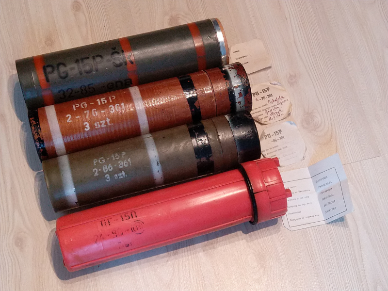 Vier Transportbehälter für Treibladungen für die 73mm Bordkanone 2A28 Grom der SPZ BMP-1 und BMD-1. Lizenzfertigungen aus der CSSR (Blech), 2x Polen (Pertinax und Plast) sowie Bulgarien (Plast). Komplett mit Packzetteln und Abstandhaltern aus Pappe. Frei von jeglichen Gefahrstoffen, nur leere Behälter.