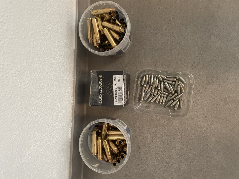 Biete aus Nachlass 164 Hülsen, 7,5x55 Swiss, (114 x S&B/50 x TSC). Hülsen wurden in einem Indoorstand aus einem K 31 als Fabrikmunition verschossen und im Tumbler nass gereinigt. Teilweise in der Originalschachtel. Zündhütchen sind noch in der Hülse enthalten. Sortenrein jedoch nicht losrein. Boxerzündung. Nicht wiedergeladen. Weiterhin sind noch 49 Geschosse, welche sich bei den Hülsen befanden dabei (147 gn, Marke unbekannt, vermutlich Kaliber .308). Sollten vermutlich verladen werden.
