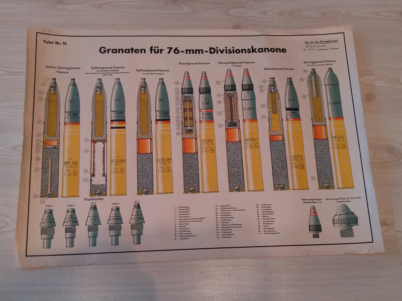 Originale Lehrtafel (84 x 59 cm, DIN A1) aus dem Jahre 1954 der Kasernierten Volkspolizei. Verschiedene 76mm Patronen für die Divisionsartillerie. Darunter einige Munitionssorten, welche nach dem Krieg bald ausgesondert wurden. Seltenes und dekoratives Plakat mit nur leichteren Gebrauchsspuren. Versand erfolgt ungefaltet