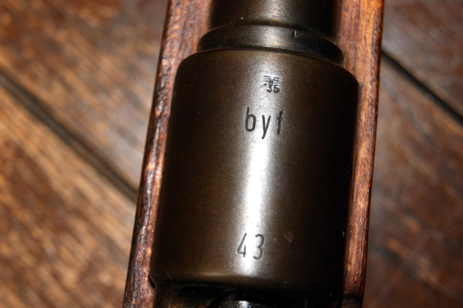 k98 byf 43 nummerngleich Kaliber 8x57JS, die Waffe ist mit eingetrockneten Fett überzogen, der Lauf hat ein scharfkantiges Zug-Feldprofil und ist spiegelblank. Die Waffe hat keinen Neubeschuss und wird nur an Händler, Sammler oder zum Export verkauft.