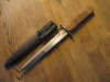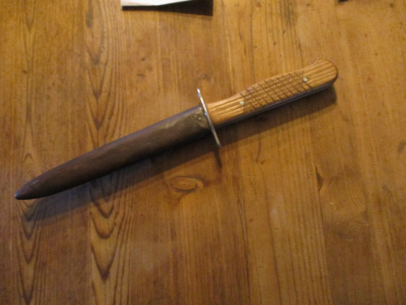 Nummerngleicher Kampfdolch/Grabendolch der Luftwaffe mit Stiefelclip. Länge ca.30cm gesammt, Klinge 16cm. Leider hat man auf der Klinge das Dreieck mit der Herstellernummer überpunzt mit einem Ritter. Auf dem Griffstück sind vorne wie hinten noch leicht Dreiecke zu erkennen.