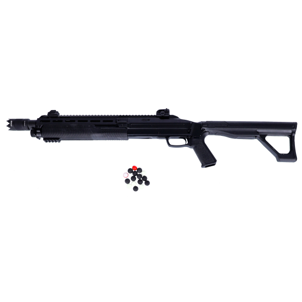 Extreme Situationen verlangen nach extremeren Maßnahmen. Die Antwort ist das T4E TX 68 Pump-Action-Gewehr im starken Kaliber .68. Neben der mächtigen Optik und dem beeindruckenden Sound des Durchladens überzeugt es durch seine intuitive Bedienung und die robuste Verarbeitung des Metallgehäuses. Das und die massive Mündungsbremse bringen die Tactical Xtreme 68 auf das satte Gewicht von über 3 kg und sorgen zusätzlich für eine enorme Stabilität im Einsatz. M-LOK-Slots im vorderen Schaftbereich erhöhen die Vielseitigkeit der TX 68. Zuvor lässt sie sich dank des Quick-Piercing-Systems monatelang im Standby aufbewahren. Bereits mit 16 Rundkugeln und mit eingesetzten 12 g CO?-Kapseln bestückt, reicht ein leichter Stoß auf die Schaftrückseite, um die Kapseln anzustechen. Die sichtbare und spürbare Druckanzeige zeigt die Einsatzbereitschaft immer klar an. Als Munition steht dem Schützen das gesamte Sortiment der T4E-Rundkugeln zur Auswahl. Für den Einsatz als Farbmarkierer empfehlen wir, die TX 68 mit unseren Markingballs (MAB) oder Chalkballs (CKB) zu betreiben. Bei Verwendung klassischer Paintballs mit Gelatinehülle kann es konstruktionsbedingt vermehrt zum Platzen der Kugel beim Zuführen oder im Lauf kommen.