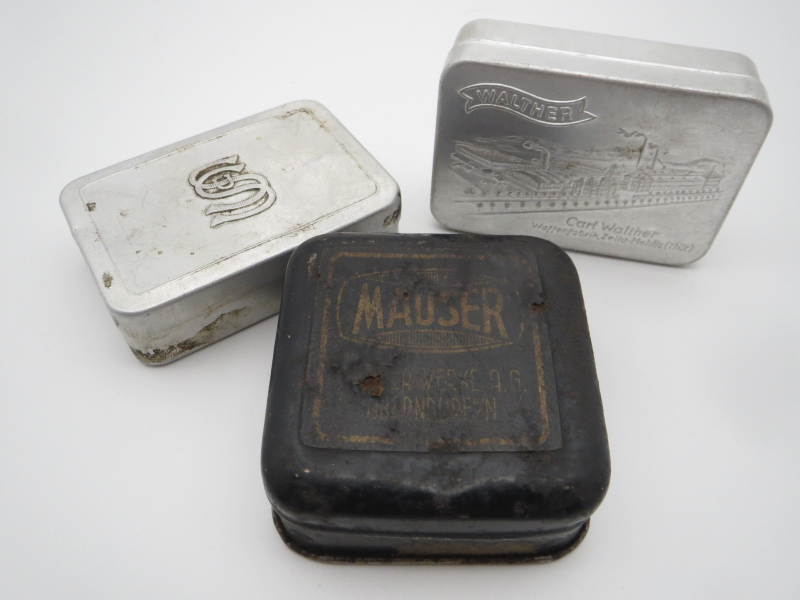 Verkaufe alle Zubehör Putzdosen die im Verkauf dabei waren für Walther Zella Mehlis, Sauer 38h und Mauser Pistolen. So wohl nie wieder im Angebot. Gebrauchsspuren vorhanden. Keine Durchrostungen. Bilder zählen zur Beschreibung keine Gewährleistung oder Rücknahme, Tausch da von Privat verkauft. Mehr Bilder auf Anfrage. Bitte stellen Sie Fragen vor Ablauf der Auktion. Versandgebühren gelten für den versicherten Versand für Deutschland ohne Inseln.