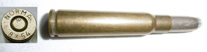 eine Deko-Patrone 8x54 Norma ( NORMA 8x54 ) ein speziell skandinav, Kaliber von Norma, hier unbekannt. Patrone ist ohne Ladung, zum Nachweis ist eine Klapper-Kugel eingelegt.