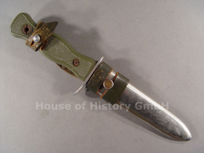 Bundeswehr Kampfmesser, Griffschale mit unkenntlich gemachter "BW" Stempelung, Klinge mit Stempelung "HSK 70", Klinge wurde geschärft, Scheide ohne Farbe, benutzter Zustand