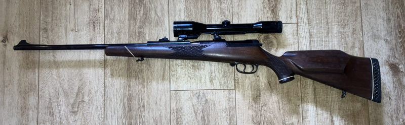 Ausgestattet ist die Büchse mit einem Zeiss 6x42 Zielfernrohr, montiert auf einer klassischen Suhler Einhakmontage. Zudem verfügt sie über einen deutschen Stecher, der einen präzisen Schuss ermöglicht.