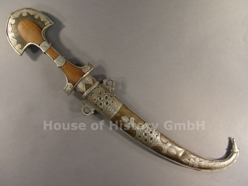 Marokkanischer Krummdolch um 1900, Messingscheide mit gravierten Neusilberbeschlägen, Holzgriff ebenso mit gravierten Neusilberbeschlägen, Klinge aus Eisen Länge 20,5 cm, Gesamtlänge ca.43 cm, sehr schöner Zustand