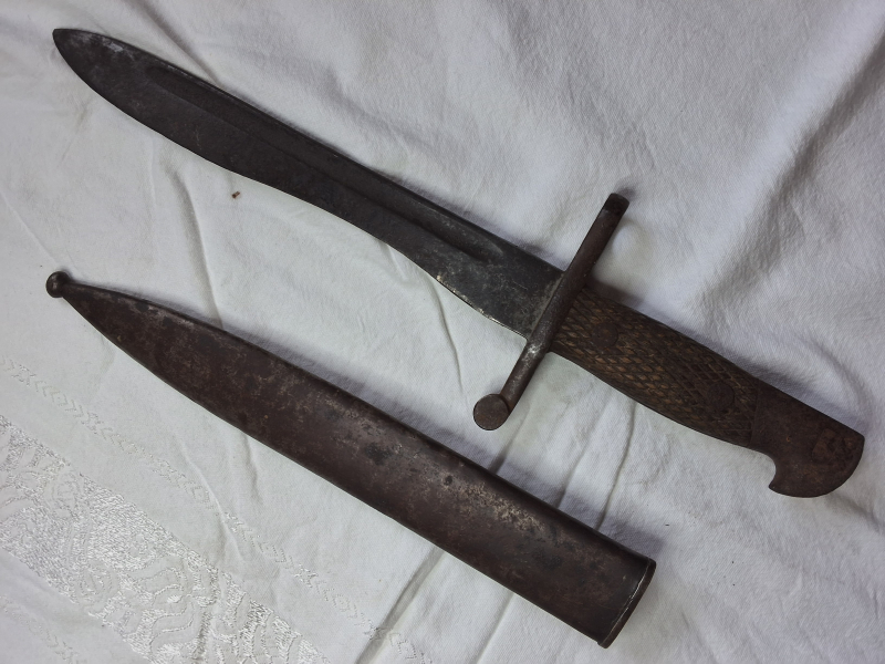 Biete orginales Toledo Bajonett. Dachbodenfund, auf der Klinge viel altes Fett, sicherlich zu verbessern. Länge 39,5 cm. Drücker gängig. Rest siehe gute Bilder.