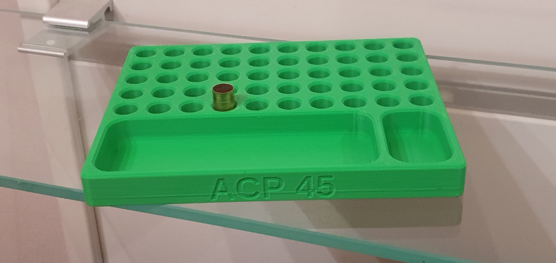 Ladebrett für Kaliber ACP 45 mit Geschossschale und Schale für Zündhütchen. So hat man alles gleich an einer Stelle um Handgriffe zu fereinfachen. Das Ladebrett bietet platz für 50 Geschosse. Die Hülsen stehen sicher an Ort und stelle.