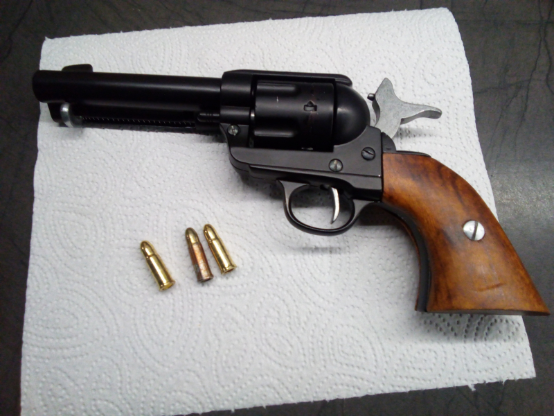 Biete einen Western Revolver Modell 45.mit holzgriffschalen.spannen und abschlagen und Trommel dreht sich.mit drei Patronen.