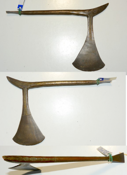 Afrikanisches Beil, eventuell Werkzeug, aus einem Stück gegossen, Bronze, Stielende als Schaber ausgebildet, Klingenlänge 16cm, Stiellänge 26,5 cm, sehr guter patinierter Zustand