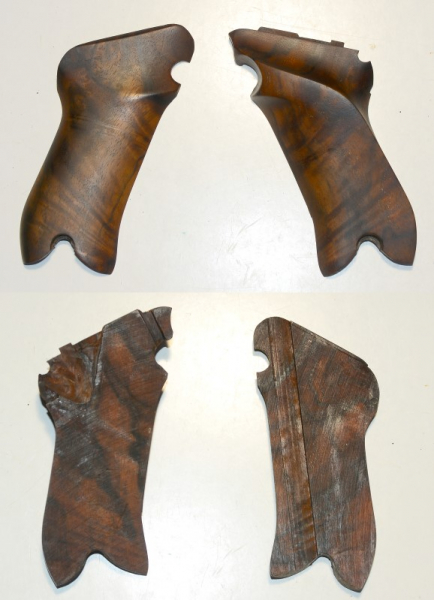 Dunkle Nussholzgriffschalen mit Daumenauflage für Luger Pistole, neuwertig und ungebraucht, ehemaliger Preis mehr als 100 €