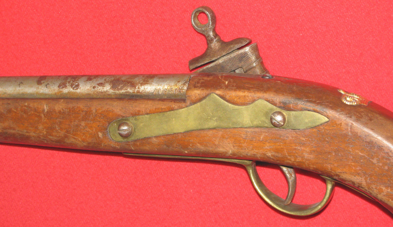 Zum Verkauf kommt eine Steinschloss Pistole mit Fehler an der Batterie, da ist was abgebrochen