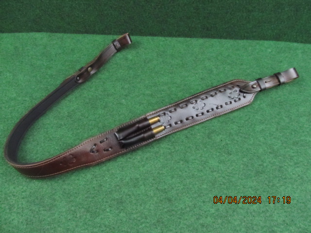 Dieser wunderbar gefertigte Gewehrriemen aus echtem Rindleder hat eine Länge von ca. 104 cm. Der Riemen ist mit schönen Lederarbeiten und Verzierungen geschmückt. Durch die qualitativ sehr hochwertige Verarbeitung ist der Riemen sehr robust und widerstandsfähig. Dies ist keine Stangenwahre, sondern beste Sattlerarbeit. Der Riemen hat über die gesamte Länge auf der Rückseite / Trageseite eine Polsterung sowie eine Antirutsch-Oberfläche zum bequemen und sicheren Tragen. Die Länge des Riemens ist beidseitig um 3 Löcher verstellbar (6,5 cm!!). Die Farbe ist Braun.