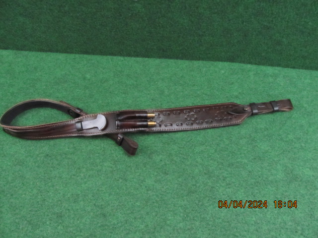 Dieser wunderbar gefertigte Gewehrriemen aus echtem Rindleder hat eine Länge von ca. 104 cm. Der Riemen ist mit schönen Lederarbeiten und Verzierungen geschmückt. Durch die qualitativ sehr hochwertige Verarbeitung ist der Riemen sehr robust und widerstandsfähig. Dies ist keine Stangenwahre, sondern beste Sattlerarbeit. Der Riemen hat über die gesamte Länge auf der Rückseite / Trageseite eine Polsterung sowie eine Antirutsch-Oberfläche zum bequemen und sicheren Tragen. Die Länge des Riemens ist beidseitig um 3 Löcher verstellbar (6,5 cm!!). Die Farbe ist Braun.
