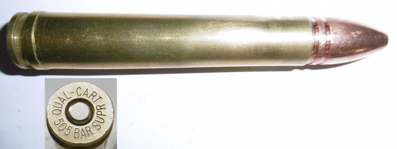 eine Deko-Patrone .505 Barnes Supreme ( QUAL-CART 505 BAR SUPR ) Quality-Cartridge stellt ehemalige wildcats als Kleinserie mit korrektem Kaliber im Bodenstempel her. Patrone ist ohne Ladung, zum Nachweis ist eine Klapper-Kugel eingelegt.