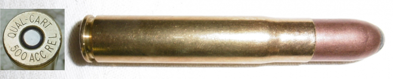 eine Deko-Patrone .500 Accurate Reloading ( QUAL-CART 500 ACC REL ) 2006 von Jeff Smith für Accurate Reloading entwickelt. Quality-Cartridge stellt ehemalige wildcats als Kleinserie mit korrektem Kaliber im Bodenstempel her. Patrone ist ohne Ladung, zum Nachweis ist eine Klapper-Kugel eingelegt.