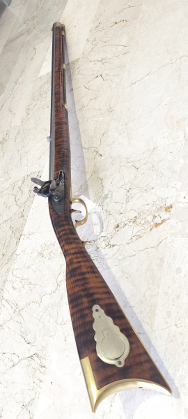 Die Unterseite des Laufs ist mit „.45 caliber“ und der zweistelligen Seriennummer I 28 I gekennzeichnet. Siehe Foto 10 (kleinere Mängel). Siehe auch Fotos 11 (Kratzer) und 12 (kleines Loch an der Ladestockaussparung), das jedoch bei eingesetztem Ladestock nicht sichtbar ist. Der Abzugsbügel ist gerissen, sitzt aber fest. Die Waffe ist zweiteilig zerlegbar und daher sehr praktisch und transportabel. Gesamtlänge: 122 cm; Lauflänge: 84,05 cm; Gewicht: 3400 g.
