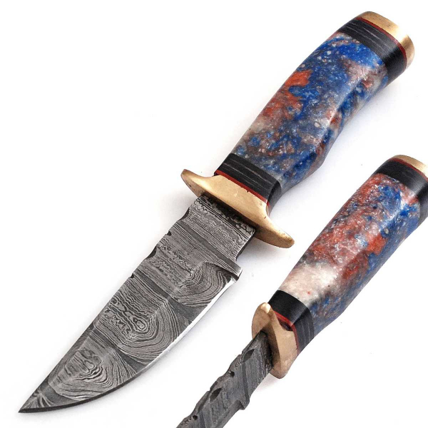 Unser Damaszener wird sehr aufwendig aus zwei verschiedenen Stahlsorten 1095 & 15N20 Handgeschmiedet. Durch fünffaches Verdoppeln der Stahl Lagen und erneutes Schweißen wird die Anzahl der Lagen so vervielfacht. Somit hat Unser Damaszener 288 Lagen wurde 5 Mal gefaltet. Dies zeichnet unsere Messer durch seine lang bleibende Schärfe, Zähigkeit und Härte aus.