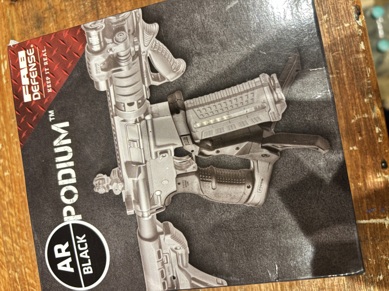Biete ein FAB Defense AR Podium in Schwarz an, auf der Verpackung als „AR BLACK PODIUM“ gekennzeichnet.