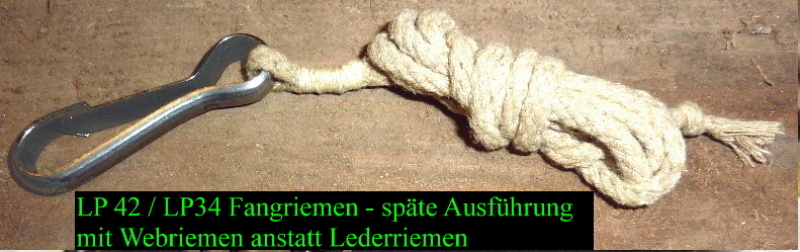 absolute top top Rarität aus dem WK2; konkret ergattern sie hier einen originalen Fangriemen für die LP42 und für die LP34; diese wurden noch bis hin zur Kriegsmitte aus einem Lederriemen mit Haken gefertigt; gegen Kriegsende wurde allerdings aufgrund der Materialknappheit anstatt des Lederriemens diese starke Kordel in der Fertigung verwendet; so konnte diese auf der einen Seite am Koppelriemen befestigt werden bzw. wurde der Karabinerhaken an der LP am Griffstück eingehakt. So konnte man die LP42 bzw. LP34 in der Hitze des Gefechtes auch nicht verlieren.