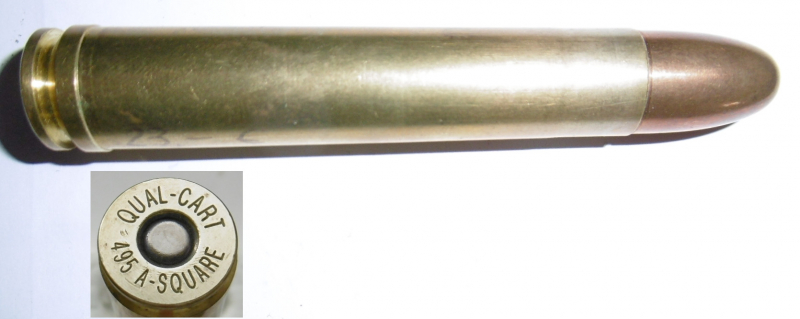 eine Deko-Patrone .495 A-Square ( QUAL-CART 495 A-SQUARE ) Quality-Cartridge stellt ehemalige wildcats als Kleinserie mit korrektem Kaliber im Bodenstempel her. Patrone ist ohne Ladung, zum Nachweis ist eine Klapper-Kugel eingelegt.