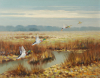 Dargestellt wird eine jagdliche Szene aufsteigender Wildenten aus einem sumpfartigen Altwassertümpel.