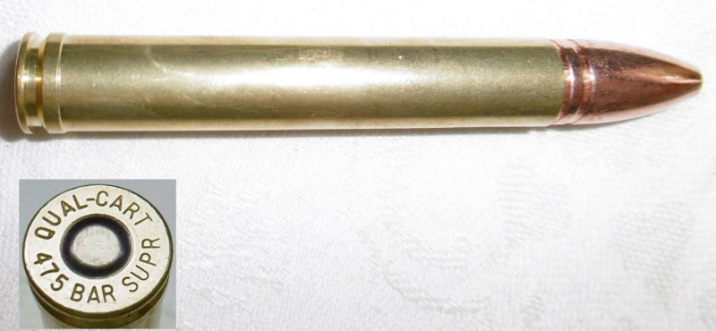 eine Deko-Patrone .475 Barnes Supreme ( QUAL-CART 475 BAR SUPR ) Quality-Cartridge stellt ehemalige wildcats als Kleinserie mit korrektem Kaliber im Bodenstempel her. Patrone ist ohne Ladung, zum Nachweis ist eine Klapper-Kugel eingelegt.