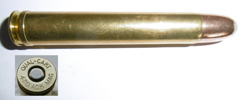 eine Deko-Patrone .470 Ackley Magnum ( QUAL-CART 470 ACK MAG ) Quality-Cartridge stellt ehemalige wildcats als Kleinserie mit korrektem Kaliber im Bodenstempel her. Patrone ist ohne Ladung, zum Nachweis ist eine Klapper-Kugel eingelegt.