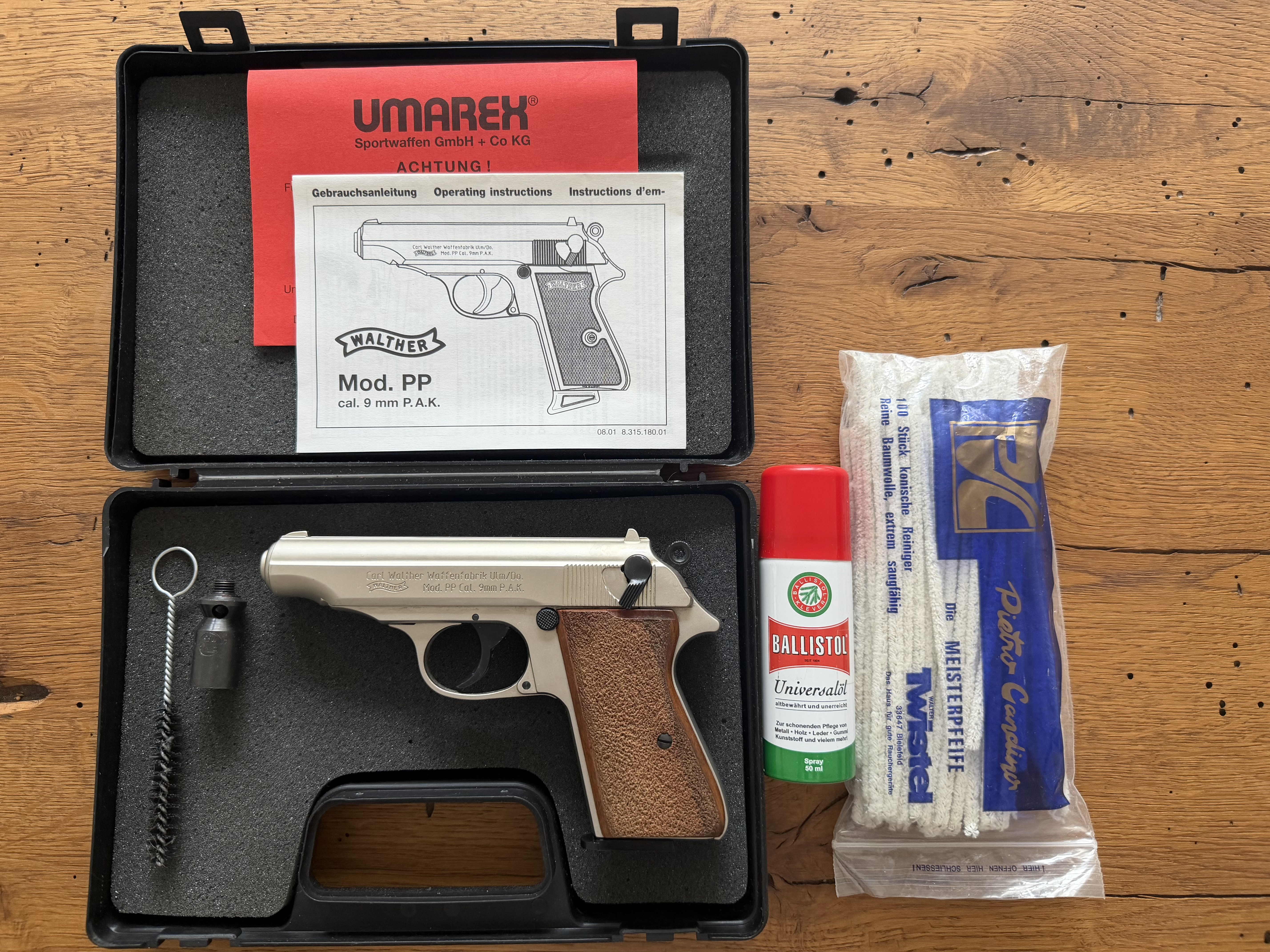 Zum Verkauf steht eine Schreckschusspistole Modell Walther PP 9mm P.A.K. im seltener vernickelter Optik sowie Holzgriff vom Hersteller UMAREX im Bestzustand.