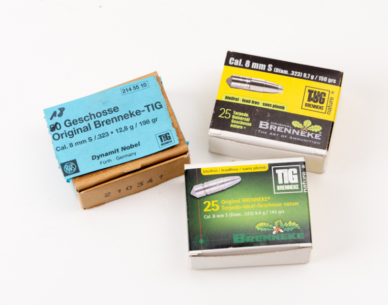 Zum Verkauf steht ein Konvolut an hochwertigen Jagdgeschossen für Wiederlader im Kaliber 8 mm S (Diameter .323). Das Paket besteht aus drei Schachteln: - 1x 25 Stück Original Brenneke TUG nature (Torpedo-Universal-Geschoss), 9,7 g / 150 grs, bleifrei. - 1x 25 Stück Original Brenneke TIG nature (Torpedo-Ideal-Geschoss), 9,4 g / 145 grs, bleifrei. - 1x angebrochene Schachtel RWS / Dynamit Nobel Original Brenneke-TIG, 12,8 g / 198 gr. (Auf der Originalschachtel von 50 Stück ist handschriftlich eine 18 notiert, es sollten sich also noch 18 Geschosse darin befinden). Insgesamt ca. 68 Geschosse. Ideal zum Testen von Laborierungen, besonders wenn man auf bleifreie Jagdmunition umstellen möchte.