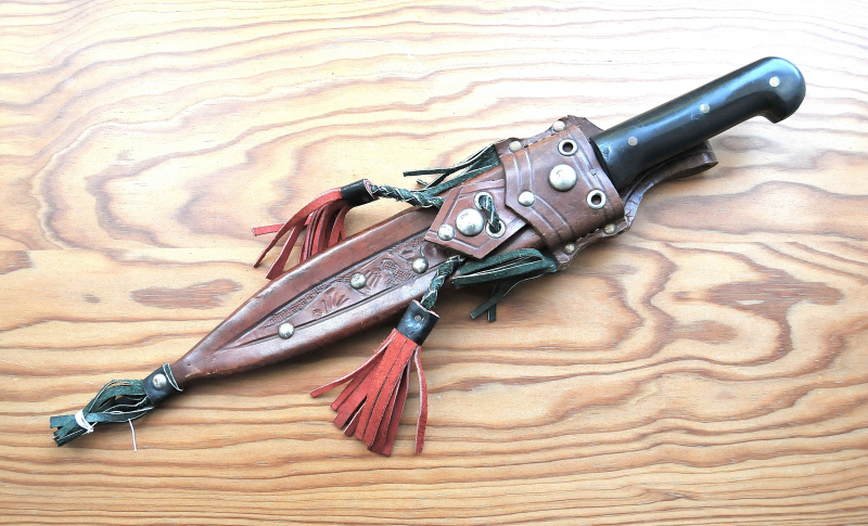 Die reich verzierte, mit glänzenden Nieten versehene Lederscheide ist mit diversen symbolischen Aufdrücken und farbigen geflochtenen Lederanteilen geschmückt. Auf der Rückseite groß „HECHO EN EL SALVADOR“. Sie ist offensichtlich komplett handgefertigt und in noch sehr gutem Zustand. Geringe Gebrauchsspuren. Keine nachweisbaren Fehler.